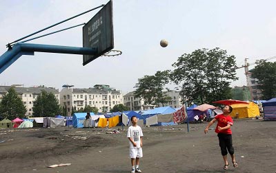 6月17日,兩名都江堰兒童在一排救災(zāi)帳篷前打籃球。記者高劍平攝