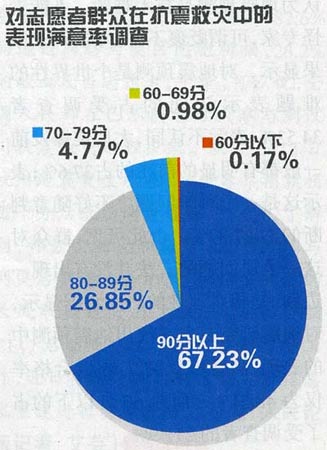 數(shù)據(jù)顯示,對(duì)志愿者在抗震救災(zāi)中的表現(xiàn),67.23%的受調(diào)查者給出了90分以上的高分,給80分以上的則占到了94.08%,滿意率達(dá)到了98.85%。NGO組織和志愿者群體是此次抗震救災(zāi)中的一支特別突出的力量,社會(huì)、新聞媒體無不為他們的出現(xiàn)和廣泛參與歡欣鼓舞,并喻其為公民社會(huì)發(fā)育的有力證明。從雪災(zāi)到3·14藏獨(dú)事件,再到汶川大地震,中華民族可謂空前團(tuán)結(jié),愛國(guó)熱情一浪高過一浪,在這一浪又一浪的愛國(guó)熱情面前,年輕人受到了洗禮,“80后”、“90后”得到了很好的鍛煉,表現(xiàn)讓世人側(cè)目。在志愿者隊(duì)伍里,活躍著為數(shù)不少的“80后”、“90后”,綠絲帶等志愿行動(dòng)多數(shù)就是由他們發(fā)起。唐山志愿者、山東農(nóng)民工志愿者等等都給人們留下了深刻的印象。
