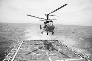 “方位××度,距離××鏈,目標(biāo)正在急速突破我海區(qū),請求直升機(jī)突擊!”接到命令,空中反潛直升機(jī)迅速撲向目標(biāo)海區(qū)。開艙,投彈,數(shù)分鐘后,目標(biāo)被一舉擊沉。