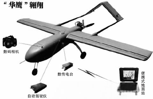 這款名為“華鷹”的無人機(jī)數(shù)次出現(xiàn)在青川、北川,對抗震救災(zāi)發(fā)揮了積極的作用。據(jù)四川省測繪局的專家介紹,“華鷹”是四川省測繪局專程向國家測繪局申請派來支援災(zāi)區(qū)的!叭A鷹”無人機(jī)航攝系統(tǒng)通過了國家測繪局鑒定,飛機(jī)系統(tǒng)采用GPS導(dǎo)航自主飛行,裝備專業(yè)數(shù)碼相機(jī),可在半徑15千米的范圍內(nèi)穩(wěn)定可靠飛行3小時,自動拍攝地面高分辨率航空影像,生成高清晰地面影像。