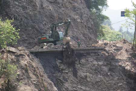 據(jù)悉,從6月4日始搶通了石門村至麻柳坪的道路后,鎣華鎮(zhèn)天寶村、瓦窯村、八角鎮(zhèn)雙橋村及八角鎮(zhèn)至彭州的山路共5條已全部打通,累計土石方10500余立方米。其中,鎣華鎮(zhèn)天寶村至五組的道路長4.2公里,成空某機場工兵勤務隊采用人工配合機械的方式,輔以炸藥爆破,至6月18 日搶通該道路。6月24日,又完成馬祖到五組的路基處理工作。搶險部隊表示,雖然如今道路已通,但由于余震不斷各路段仍有塌方,因此山路險情仍不容忽視。