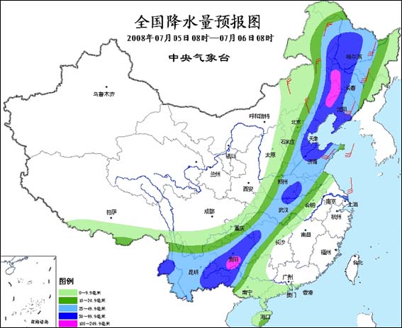 7月5日08時至7月6日08時,西藏南部和東部、甘肅東南部、陜西大部、內(nèi)蒙古中東部、東北大部、華北、黃淮、江淮大部、江漢、湖南西部和北部、西南地區(qū)、廣西中西部、廣東西南部沿海、海南等地有小到中雨或雷陣雨,其中,內(nèi)蒙古東部、東北中西部、華北東部、黃淮大部、江漢地區(qū)大部、湖南西北部、重慶東部和南部、四川南部、貴州大部、云南大部、廣西西部等地有大到暴雨,局地有大暴雨,上述部分地區(qū)并伴有短時雷雨大風(fēng)或冰雹等強對流天氣。內(nèi)蒙古東北部、東北地區(qū)有4~5級偏南或偏北風(fēng),渤海、黃海、東海北部有5~6級偏南風(fēng)。