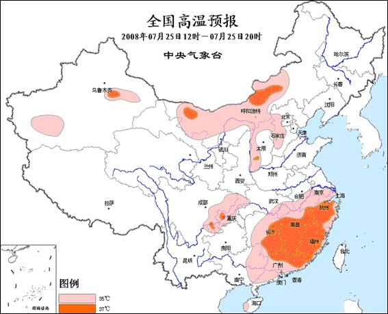 中新網(wǎng)7月25日電 中央氣象臺2008年7月25日10時發(fā)布高溫預(yù)報:預(yù)計今天白天,江淮南部、江南大部、華南中東部、四川盆地東部、重慶大部以及新疆吐魯番盆地、內(nèi)蒙古中西部、山西西部和北部、河北西部等地將有35℃以上的高溫天氣.