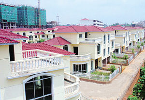 在景德鎮(zhèn)市西山路口附近,幾排別墅,鱗次櫛比,掩映在樹叢和民房之中。別墅均為紅瓦黃墻的三層小樓,房前都帶單獨(dú)小院和車庫。7月22日上午,記者來到這里時(shí),小區(qū)入口的大門已經(jīng)被緊緊鎖住。由于還沒有人入住,這里顯得格外安靜。