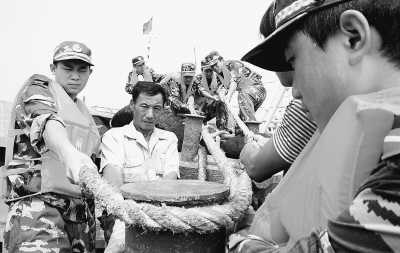 圖為7月26日,浙江臺州礁山港,邊防官兵幫助漁民加固纜繩,以防范臺風(fēng)“鳳凰”。郟 策攝