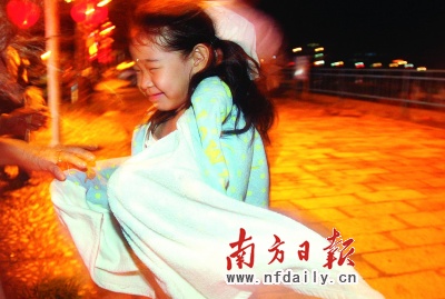 海陵島上的小游客在狂風(fēng)中艱難行走。本報記者朱丹陽梁文祥攝