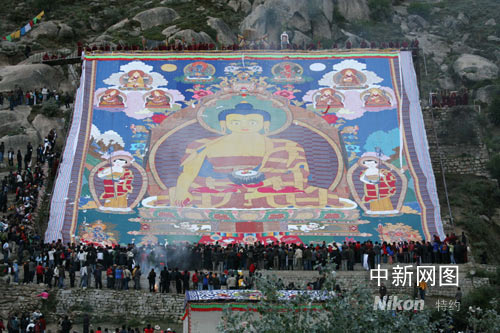 雪頓節(jié)最早是一種宗教活動(dòng),是老百姓以酸奶對(duì)寺院行長(zhǎng)凈、夏安居之事后解禁僧人的敬奉。十七世紀(jì)下半葉,雪頓節(jié)逐漸演變和固定成以藏戲匯演和展佛為主、文娛與宗教相結(jié)合的重要節(jié)日,所以又被稱為“藏戲節(jié)”、“展佛節(jié)”。自去年起。該節(jié)升格為“中國(guó)拉薩雪頓節(jié)”,成為國(guó)家級(jí)旅游、文化、經(jīng)貿(mào)節(jié)慶。今晨有上萬(wàn)游客及信眾在現(xiàn)場(chǎng)參觀了哲蚌寺展佛。