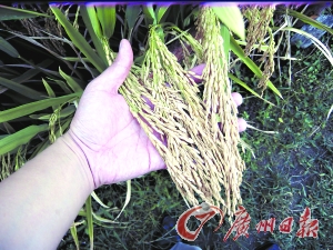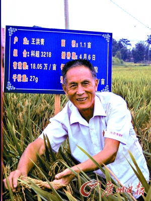 該鄉(xiāng)農(nóng)技站長鄒都樂介紹說,王洪青種的這種水稻是袁隆平院士新研制的品種“科超3218”,前幾天經(jīng)專家田間現(xiàn)場測產(chǎn),每畝有效穗超過18萬支,平均每穗實粒207粒,按每千粒27克計算,預(yù)計今年畝產(chǎn)達到1008公斤!叭绮怀鲆馔猓衲昱P巫齑暹@塊102畝的試驗田,平均畝產(chǎn)將鐵定突破900公斤!编u都樂說,村里去年就開始種上袁院士的這種超級稻,去年8月份,眼看長勢喜人的水稻即將割鐮,可惜突然來了一場“圣帕臺風”,一夜之間將水稻刮倒許多。最后收割時一測算,畝產(chǎn)只有870公斤。“如果沒有那場臺風,畝產(chǎn)900公斤的目標去年早就提前實現(xiàn)了!”