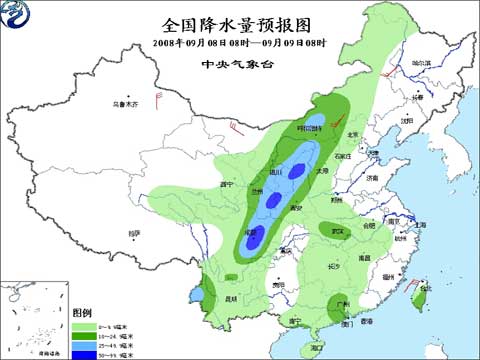 2008年9月8日8時(shí)-9日8時(shí)全國(guó)降水量預(yù)報(bào)圖