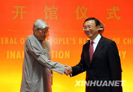 中新網(wǎng)9月8日電 據(jù)中國(guó)外交部網(wǎng)站消息,2008年9月7日,中國(guó)駐印度加爾各答總領(lǐng)事館舉行開館儀式。正在印度進(jìn)行訪問(wèn)的中國(guó)外交部長(zhǎng)楊潔篪同印度西孟加拉邦邦長(zhǎng)甘地以及當(dāng)?shù)馗鹘缛耸亢腿A僑華人代表出席儀式。
