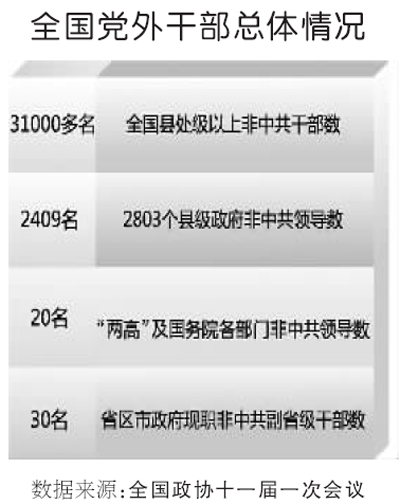 黨的十七大提出,要“選拔和推薦更多優(yōu)秀黨外干部擔(dān)任領(lǐng)導(dǎo)職務(wù)”,非中共干部培養(yǎng)選拔邁上新臺階。截至目前,全國擔(dān)任縣處級以上職務(wù)的非中共干部共3.1萬余名,數(shù)量明顯增多,結(jié)構(gòu)進一步優(yōu)化。