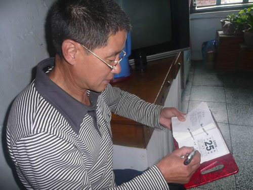 翟志強戴著花鏡計算著弟弟升入太空的時間。