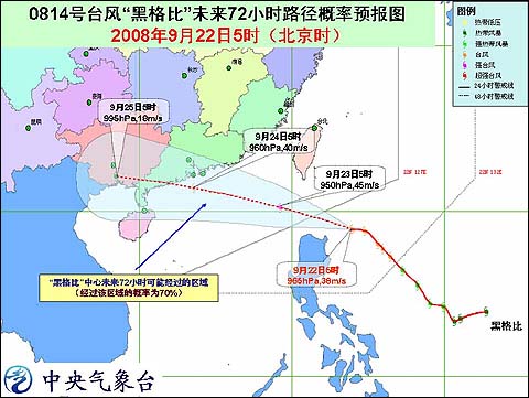 中新網(wǎng)9月22日電 據(jù)問(wèn)天網(wǎng)消息,中央氣象臺(tái)今天早晨六時(shí)發(fā)布臺(tái)風(fēng)消息:今年第14號(hào)臺(tái)風(fēng)“黑格比”(HAGUPIT)的中心今天早晨5時(shí)其位于我國(guó)臺(tái)灣省恒春市東南方大約490公里的西北太平洋洋面上,就是北緯18.9度,東經(jīng)124.0度,中心附近最大風(fēng)力有13級(jí)(38米/秒)。