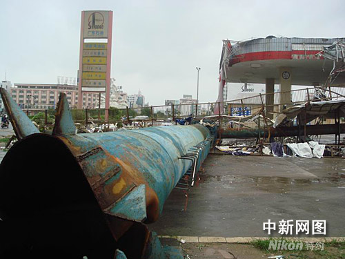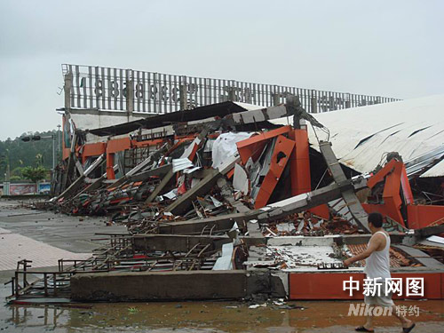 圖為市區(qū)一家具商場的門面被風(fēng)雨摧毀。