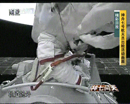 中新網9月27日電 中國“神七”載人飛船航天員翟志剛今天下午16時43分左右順利出艙,實施中國首次空間出艙活動。他取下放置在軌道艙外壁上固體潤滑材料試驗樣品,遞給艙里的航天員劉伯明。
