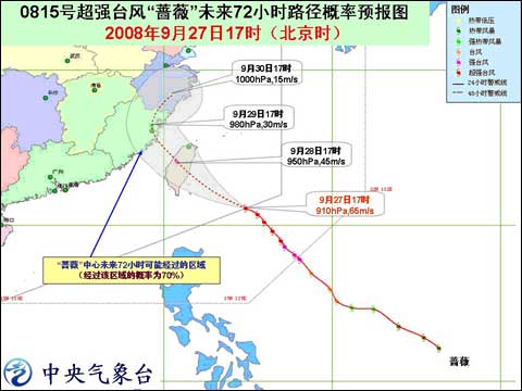 中新網(wǎng)9月27日電 據(jù)中國天氣網(wǎng)消息,中央氣象臺2008年9月27日18時發(fā)布臺風(fēng)紅色警報稱:預(yù)計,今年第15號超強(qiáng)臺風(fēng)“薔薇”將以每小時20-25公里的速度向西北方向移動,逐漸向臺灣東部一帶沿海靠近,將于明天中午到夜間在臺灣宜蘭到臺東一帶沿海登陸。