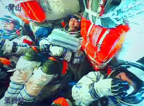 北京飛控中心指揮大廳大屏幕顯示,北京時(shí)間9月28日下午15時(shí)30分許,神舟七號(hào)飛船返回艙正在做環(huán)繞地球第45圈的旅行,三名航天員即將返回地球,此刻他們已經(jīng)穿好艙內(nèi)航天服,神態(tài)安詳平靜。 李非攝