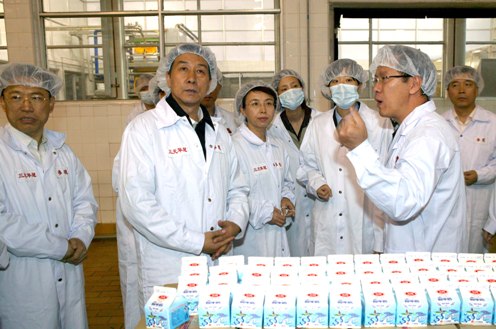 王勇一行首先來(lái)到位于北京密云縣工業(yè)開(kāi)發(fā)區(qū)的內(nèi)蒙古伊利實(shí)業(yè)集團(tuán)股份有限公司北京乳品廠,察看企業(yè)原料奶收購(gòu)、企業(yè)實(shí)驗(yàn)室、生產(chǎn)下線環(huán)節(jié)、企業(yè)成品庫(kù)等環(huán)節(jié)。在該公司生產(chǎn)車間,王勇一邊查看生產(chǎn)線,一邊向公司負(fù)責(zé)人詢問(wèn)產(chǎn)品的原料供應(yīng)、質(zhì)量檢測(cè)項(xiàng)目和工藝流程等情況。當(dāng)了解到每批產(chǎn)品都要經(jīng)過(guò)企業(yè)自檢、質(zhì)檢部門的抽檢和國(guó)家食品質(zhì)量安全監(jiān)督檢驗(yàn)中心的檢驗(yàn)合格后才出廠銷售,王勇露出了滿意的笑容。他向企業(yè)負(fù)責(zé)人叮囑,產(chǎn)品質(zhì)量是生產(chǎn)、制造出來(lái)的,而不是檢驗(yàn)出來(lái)的,企業(yè)是產(chǎn)品質(zhì)量安全的責(zé)任主體,一定要加強(qiáng)責(zé)任意識(shí)和誠(chéng)信意識(shí),加強(qiáng)質(zhì)量監(jiān)管和嚴(yán)格自律, 在生產(chǎn)加工各個(gè)環(huán)節(jié)都要落實(shí)安全措施,一環(huán)扣一環(huán),不能有一絲一毫的疏漏。公司負(fù)責(zé)人表示,伊利公司將嚴(yán)格按照相關(guān)的標(biāo)準(zhǔn)要求,生產(chǎn)出更多更好的產(chǎn)品。公司已采取了“三清理”的措施,即全面清理市場(chǎng)上的產(chǎn)品、全面清理庫(kù)存的產(chǎn)品、全面清理原輔材料,對(duì)不合格品堅(jiān)決予以銷毀,以確保市場(chǎng)上銷售的產(chǎn)品都是合格的。