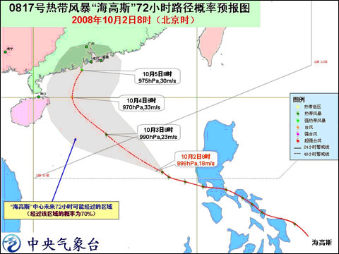 中新網(wǎng)10月2日電 據(jù)中國天氣網(wǎng)消息,中央氣象臺今天上午發(fā)布臺風(fēng)消息說,今年第17號熱帶風(fēng)暴“海高斯”(Higos)的中心已于昨天午夜前后進入南海東部海面,今天上午8時風(fēng)暴中心位于廣東省珠海市南偏東方大約880公里的南海中部海面上,就是北緯15.4度,東經(jīng)117.9度,中心附近最大風(fēng)力有8級(18米/秒)。