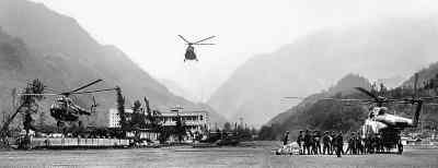直升機在深山峽谷間執(zhí)行抗震救災(zāi)任務(wù)。