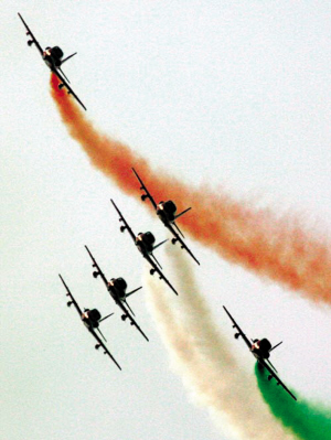Kiran MKⅡ是印度自行研制的教練機(jī),上世紀(jì)60年代裝備部隊(duì),與現(xiàn)役作戰(zhàn)飛機(jī)間的技術(shù)差距較大,而且本不適用于表演。但這些并不影響“陽光”的編隊(duì)飛行難度。據(jù)稱,“陽光”飛行表演隊(duì)是1996年在印度空軍參謀長的個人堅(jiān)持下才從空軍抽調(diào)尖子飛行員組建的。一些航迷以“令人尊敬”四個字來評價“陽光”。