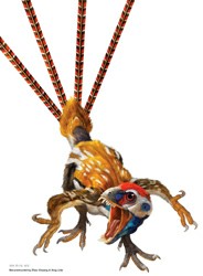 “胡氏耀龍”生活在侏羅紀(jì)時(shí)期,身體全長(zhǎng)超過40厘米,屬于鳥翼類,代表了和鳥類關(guān)系最為接近的恐龍之一。不同于其他已知恐龍,“胡氏耀龍”長(zhǎng)有4枚長(zhǎng)約20多厘米的帶狀尾羽。更有意思的是,它的其他羽毛均未形成為類似鳥類飛羽的構(gòu)造,雖然“胡氏耀龍”的前肢長(zhǎng)于后肢,形成了類似原始鳥類的前肢,但由于沒有飛羽,“胡氏耀龍”并不具有飛行能力。