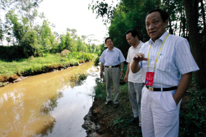 三位暗訪的省人大代表在排放口仔細觀察!斑@里肯定存在偷排污水現象,否則怎么會淤積這么厚的黑泥?”省人大環(huán)資委副主任委員潘大林說。他還指給記者看,排放口上游河岸兩邊是黃泥,到下游就變成黑色,水面也開始漂浮油污。