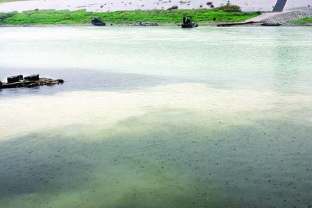 昨日上午11時(shí),記者可以清晰地看到河水的顏色分成好幾個(gè)層次,約五十米寬的河面上,最靠近岸邊的是黑色,再過(guò)去一點(diǎn)的是鮮明的乳白色,越往河心顏色越濃,整個(gè)河面呈現(xiàn)出白得發(fā)青的顏色,排水口還在不停地往河里排放乳白色、漂著白色泡沫的污水,早上的大雨也絲毫沒(méi)能沖散掉乳白色的河水。
