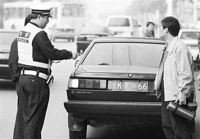 北京交警對(duì)違反“五日制”限行規(guī)定者進(jìn)行處罰。