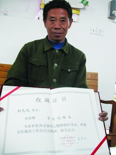 劉元九展示國(guó)家博物館頒發(fā)給他的收藏證書(shū)。