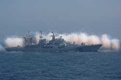 “和平使命-2005”中俄聯(lián)合演習(xí)在黃海舉行,我導(dǎo)彈驅(qū)逐艦發(fā)射干擾彈。
