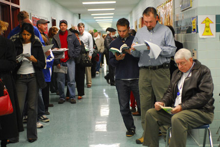 等到孩子們真正長大可以投票的時候,他們在熱情高漲的同時又不乏理性。在呂芳的想像中,投票站應該是兩方對壘,支持者搖旗吶喊才對。結果卻完全出乎他的預料。大選當天,呂芳所在小組參觀的第一個投票點在弗吉尼亞Falls Church縣的一個社區(qū)活動中心。他們到那里時剛過6點,投票點外已經(jīng)排起了長龍,蜿蜒足有一二百米。人群中,有人帶著蹣跚學步的孩子,有人坐著輪椅,有人自己帶著椅子……“但是,整個人群靜悄悄的,沒有一點激動人心的表現(xiàn)!