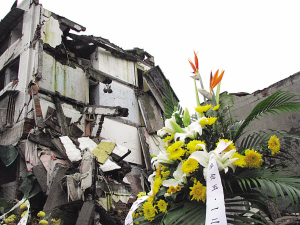 花籃上寫有“沉痛悼念”的字樣,它讓記者一下子想起,再過一天便是汶川大地震半年祭的日子。很多人都惦記著這個日子,不是有這么一句話么:人類之所以文明,人性之所以偉大,便是因?yàn)槲覀円恢惫虉?zhí)地選擇向逝者致哀。