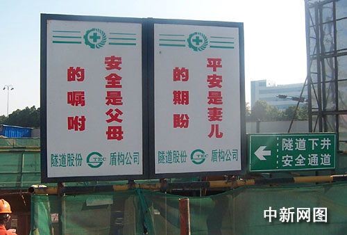在地鐵施工現(xiàn)場,安全標語高高樹立。 作者:汪恩民