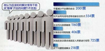 “你認(rèn)為應(yīng)該如何解決領(lǐng)導(dǎo)干部找‘替身’開(kāi)會(huì)的問(wèn)題?”問(wèn)卷調(diào)查結(jié)果顯示,65.03%的受調(diào)查者認(rèn)為“盡量減少不必要的會(huì)議”,37.7%的受調(diào)查者認(rèn)為“會(huì)議的內(nèi)容要精簡(jiǎn),有的放矢”,23.56%的受調(diào)查者認(rèn)為“對(duì)找‘替身’開(kāi)會(huì)的現(xiàn)象加大管理力度,對(duì)相關(guān)人員要進(jìn)行懲罰”,18%的受調(diào)查者認(rèn)為“加大運(yùn)用電視電話等創(chuàng)新會(huì)議形式”。由此可見(jiàn),表示應(yīng)減少會(huì)議或精簡(jiǎn)會(huì)議內(nèi)容的占到受調(diào)查者的88.59%。