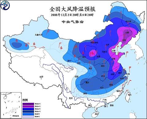 中央氣象臺2008年12月2日18時發(fā)布寒潮橙色警報: