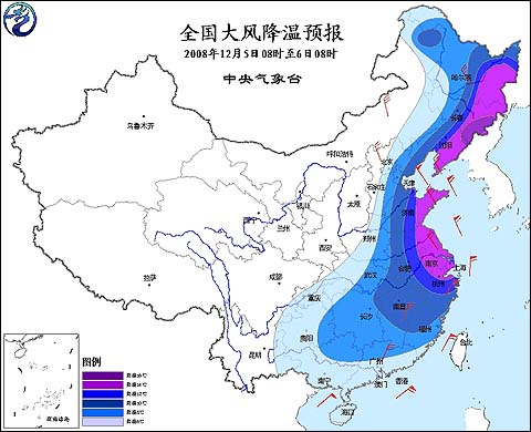 中央氣象臺2008年12月5日06時繼續(xù)發(fā)布寒潮橙色警報:
