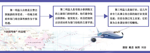 第三利益人自然就是旅行社。據(jù)了解,近幾年來專門從事公務(wù)出國的旅行社發(fā)展迅速,目前全國已有上百家,集中在廣州、上海、北京、南京、寧波等地。它們靠為公務(wù)團(tuán)安排行程賺錢!艾F(xiàn)在各級各地組織的出境、出國考察活動(dòng),絕大部分是通過旅游公司出去、并由境外旅游機(jī)構(gòu)接團(tuán)安排行程的,其實(shí)就是公款旅游!毙掠嗍形晃桓刹繉τ浾哒f。
