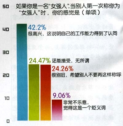 那么,女性又如何看待“女強人”這個稱呼呢?調(diào)查結(jié)果顯示,只有42.2%的受調(diào)查者選擇“很高興,這說明自己的工作能力得到了認同”,24.47%的受調(diào)查者選擇“還能接受,無所謂”。由此可見,表示能夠接受“女強人”稱呼的占受調(diào)查者的六成!芭畯娙恕狈Q呼對許多女性而言已經(jīng)不再是一個心結(jié)。