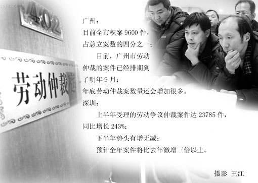 記者了解到,深圳市勞動(dòng)爭(zhēng)議仲裁院同樣面臨著勞動(dòng)仲裁案件“井噴”的問(wèn)題。該院負(fù)責(zé)人告訴記者,上半年他們受理的仲裁案件達(dá)到了23785宗,同比增長(zhǎng)了243%,下半年勢(shì)頭有增無(wú)減,預(yù)計(jì)全年的案件將比去年激增三倍以上。