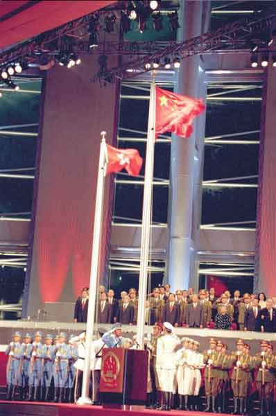 132天之后,飄揚了一百五十多年的米字旗緩緩降下,五星紅旗和紫荊花旗在東方之珠冉冉升起。