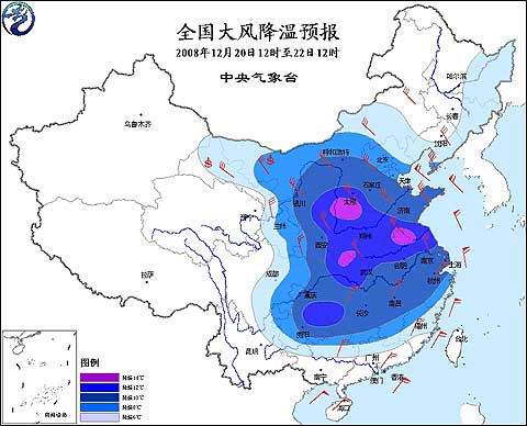 2008年12月20日12時(shí)—22日12時(shí)全國(guó)大風(fēng)降溫預(yù)報(bào)圖