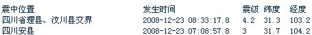 據(jù)地震臺(tái)網(wǎng)測(cè)定,北京時(shí)間2008-12-23 08:33:17.8 在四川省理縣、汶川縣交界(北緯31.3,東經(jīng)103.2) 發(fā)生4.2級(jí)地震。成都市區(qū)震感明顯。