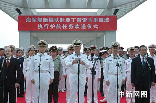 中新網(wǎng)12月26日電 由“?凇碧(hào)、“武漢”號(hào)和“微山湖”號(hào)綜合補(bǔ)給艦組成的中國海軍艦艇編隊(duì)今天下午13時(shí)45分宣布從三亞啟航,赴亞丁灣、索馬里海域執(zhí)行護(hù)航任務(wù)。中央軍委委員、海軍司令員吳勝利在歡送儀式上說,海軍艦艇編隊(duì)執(zhí)行此次護(hù)航任務(wù),是中國首次使用軍事力量赴海外維護(hù)國家戰(zhàn)略利益。