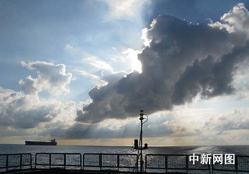 一邊想著暈不暈船的事,一邊信步從前甲板走到尾甲板,還順手在甲板上拍了幾幅“?凇迸灪叫旭R六甲海峽的風(fēng)光片,瞅著拍攝到的海天相接、軍艦劈浪、陽光與烏云“斗智斗勇”的場面,自我感覺相當(dāng)不錯。(完)