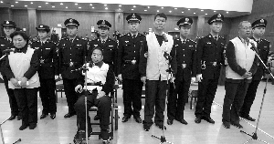 上午8時(shí),法庭開(kāi)始公開(kāi)審理,可容納400人的大審判庭內(nèi)座無(wú)虛席。原三鹿集團(tuán)董事長(zhǎng)田文華、副總經(jīng)理王玉良、副總經(jīng)理杭志奇、原奶事業(yè)部總經(jīng)理吳聚生4名高管出庭受審。其中,王玉良坐輪椅出庭。以單位犯罪成為被告的三鹿集團(tuán),則由工會(huì)主席冉偉光作為訴訟代表人出庭。