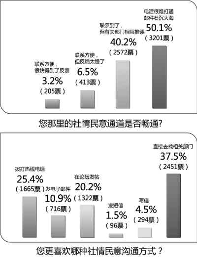在通訊方式日新月異的今天,網友更喜歡哪種社情民意溝通方式?調查顯示,如果有問題向政府咨詢或者投訴,直接去找相關部門仍是網友的首選,37.5%的人選擇了這種方式。而選擇撥打熱線電話的網友超過25%,選擇發(fā)電子郵件、在論壇發(fā)帖、發(fā)短信等新興通訊方式的超過30%,只有4.5%的網友選擇傳統(tǒng)的書信聯(lián)系方式。(記者紀雅林)