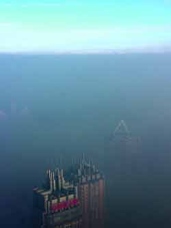 7日一大早,哈市上空灰蒙蒙一片,整座城市被繚繞的大霧籠罩著,樓房都掩映在大霧之中。紅軍街上的華融飯店雙子廈影影綽綽,十分模糊。哈市標志性建筑之一——龍塔的上半身也被煙霧“截斷”。在長江路紅旗大街交口,記者目測能見度不足50米,馬路對面就灰茫茫一片。大街小巷隨處可見戴口罩的行人。“早上出門后,感覺大霧很嗆人,就返回家取了個口罩!笔忻裢踔一壅f。“天倒是不冷,可這煙太嗆人了!笔忻耨T女士說。