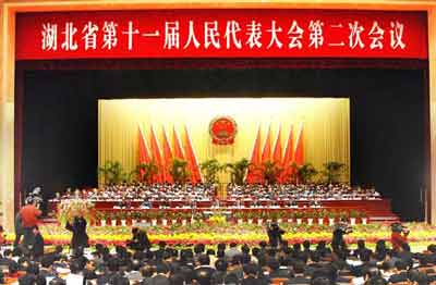 1月13日,武昌洪山禮堂門外鮮花盛開、彩旗飄揚。上午9時,湖北省第十一屆人民代表大會第二次會議在洪山禮堂隆重開幕。