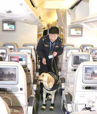 北京海關(guān)今日(13日)透露,今后,緝毒犬登機(jī)查毒將正式成為北京海關(guān)口岸緝毒的新手段。目前,兩條名叫“維特”和“泰格”的拉布拉多緝毒犬已完成了在首都機(jī)場T3航站樓進(jìn)行的首次緝毒犬登機(jī)演練。
